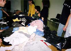 皆が持ち寄った古着や布キレなどを仕分けしているところ。