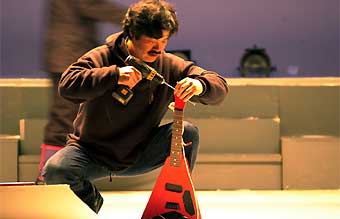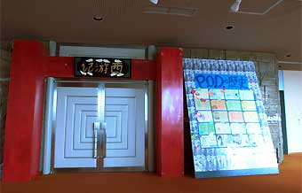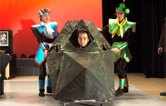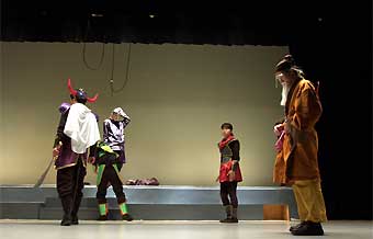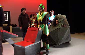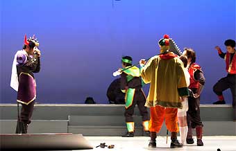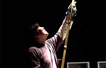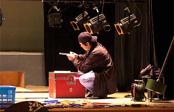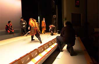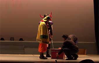 撮影は「勘坂政雄」氏 そして、レポートは「記録係」です。 公演が終わりまして早一ヶ月経とうとしていますね。(2月25日現在) ここらで忘れないうちに本番レポートの始まり始まり〜〜。 ![]() 本番当日は朝から「テーヘン」でございます。 照明セッティング中の桂 真。 特に今回の演目は大変な西遊記でした。 ご苦労様、桂君。 ![]() その努力のおかげで「カッコイイー」じゃないですか。 西遊記ロゴ・タイトルの前で仁王立ちの「金角大王」役の四柳直人。 ![]() 光物小道具の仕込み中の「演出」中島 亮。 今回も何でもかんでもやりましたね。 ご苦労様でした。 ![]() 三蔵経典が納められた「箱」の扱う注意点を 「猪八戒」役の松尾慎太郎と「牛魔元帥」役の森山一典に話す、東 延嘉。 東:「この蛇口をひねると水が出るので気をつけて下さい。」 松尾:「なんで、水道の蛇口が付いてるアルか?」 森山:「芝居に関係ないもの付けんでええ!!」 東:「つい癖で・・・、すみません。」 ・・・と、こんな会話が交わされていると思われます。(笑) ![]() 所変わって受付ディスプレーです。 CD販売コーナーにはシルクハットのP.O.D.おじさんが、 「猪八戒」役の松尾慎太郎がCDを盗んでゆくのを監視しています。 本番当日には受付は既に完成。 本番の負担にならないように金曜日の夜には完成の計画通りでした。 「芝居は入り口から始まっている!!」のコンセプトの 受付ディスプレイ担当には、宮腰小都恵、安田 枋、東 延嘉。 ご苦労様でした。 ![]() 向かって右側には大ホール入り口がありますが、 「西遊記」のロゴがまぶしい門が出来上がっています。 受付では、パンフにチラシの差込などの仕事が一段落し、談笑中のメンバーです。 左から、森川由紀子、京田充弘、松尾慎太郎、橋本美智子、永森栄一。 ![]() そのころステージ上では四本の柱の仕込み中。 天井の照明の機材の仕込みが終わらないと立てれない構造の為に、 柱を倒して補強しつつ、照明仕込みの状況を確認中の東 延嘉(左)。 ![]() ![]() 引き続き舞台中央にて沙悟浄の小道具「ギター」の ストラップの調整中の東 延嘉。 何回か衣装を着てみて動いてみると様々な手直しが発生します。 本番前はとても忙しいのです。 この裏の楽屋では衣装製作プロジェクトの中河香理を中心にした メンバーも忙しい状態でした。 ![]() そんなてんてこ舞いの状態の中、優雅に写真撮影の 左手前:「牛魔元帥」役の森山一典、 右手前:「猪八戒」役の松尾慎太郎、「経蔵」役の宮腰小都恵、「孫悟空」役の澁谷 学。 ・・・決して、嫌味ではないですよ。(笑)やることやってのことですからね。OKOK。 ![]() そろそろ夕方に近い太陽光線になりつつある、大ホールの受付と入り口。 右側に「P.O.D.の歴史」のパネルがありますが、 ここには今までの公演のチラシがズラッと貼られていまして、 「○○○○さんのデビュー作品」といった吹出しが貼られています。 え〜っ!この人はこんなに前から来ていたの!! ・・・と、新しい発見ができる楽しいパネルです。 ![]() 音響についてはワイヤレスマイク5本や、3音源など計9チャンネルの調整に加えて、 毎回、ビデオ音源をラインとマイクのミックス録音をしていますが、 その調整にかなり時間がかかっていました。 ![]() ![]() 初日はジェネラル・プローブ無しで、本番を迎えそうです。 照明の仕込みも続いているので役者は、動きやセリフのチェックを行っています。 右から「道楽道人」役のニーチェ石原、「天竺軍兵士」役の山本久美子、 「天犬将軍」役の浅野美穂子、「鉄扇公」役の浦出貴永、「牛魔元帥」役の森山一典。 ![]() 岩のシーンのチェックを行う3人。 左から「紅孩児」役の吉田賢一郎、「孫悟空」役の澁谷 学、「鉄扇公」役の浦出貴永。 実際、衣装やセット、床材などの状況が揃ったのはこの日が始めてなので、 真剣に感触を確かめています。 ![]() オープニングで使用する天竺軍管制室のオペレーターシートの動きもチェック。 ここは後から孫悟空達が飛び出してきて殺陣が始まるので、 実際の舞台でキャスター(車輪)がうまく転がるかどうか、 チェックが必要です。 本番のカウントダウンが始まると本当に楽しいものですね。 [ 前へ ] [ 第21回公演ドキュメント・トップ ] [ 次へ ]
