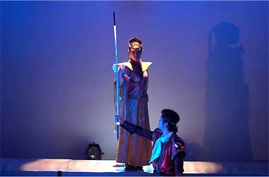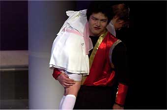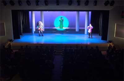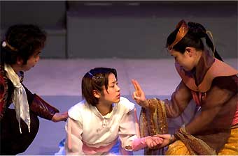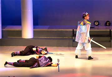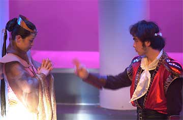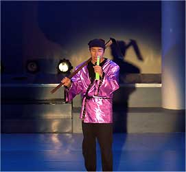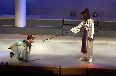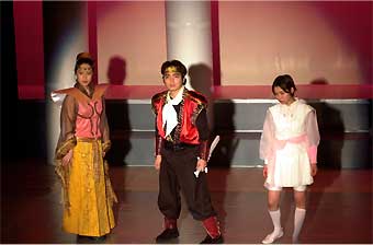 撮影は「勘坂政雄」氏 そして、レポートは「記録係」です。 ![]() ![]() 経蔵「宮腰小都恵」が孫悟空「澁谷 学」を救うべく、命をかける・・・。 ![]() 千年人参女王「中河香理」が、経蔵にまじないをかける。 ![]() 孫悟空が、千年人参女王にまじないをかける。 ![]() 3人が力を合わせて・・・。 ![]() ![]() 大音響と共に経蔵が幻奘に連れ去られるシーン。 これ以上ないくらいの悪い顔の幻奘「中島 亮」です(笑)。 ![]() 千年人参女王から、光る如意棒を授かる孫悟空。 東 延嘉、渾身の作「光る如意棒」 ![]() ここで、左:沙悟浄「東 顕司」のギターに合わせて、 中央:千年人参女王と右:美候王「本元真治」のデュエットが会場に響きます。 音楽は「蒼い月夜のバラード」です。 ![]() 最後は伝説の歌声、美候王がソロで歌います。 ![]() 三蔵の三人を操っている幻奘。 左から論蔵「竹鼻ともみ」、経蔵、法蔵「南本清美」。 ![]() 幻奘に倒された奥の天犬将軍「浅野美穂子」と、手前の天鷹将軍「永原圭介」。 体勢を立て直し、構える右の顕聖二郎神「酒井亜希子」。 ![]() 幻奘の力に成すすべの無い顕聖二郎神。 物語がクライマックスへとなだれ込んでいきます!! つづく [ 前へ ] [ 第21回公演ドキュメント・トップ ] [ 次へ ]