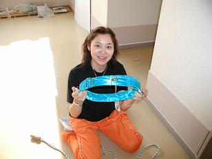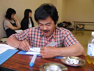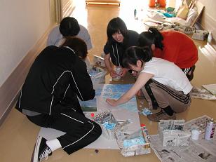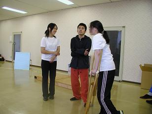 こんにちは!中川英子です(^-^) 今回は本番直前!6月の様子をお届けします。 もうすぐ本番ということもあって、全員の意識がまとまってきました! でもどこか和やかなムードが漂うのがP.O.D.ですね。(笑) (写真撮影:桂 真・浅野美穂子) セットを作るのに毎回がんばっている東 延嘉。 ちょっと寝不足気味かな?お疲れ様です。 お父様の東 嘉隆さんにも毎回お世話になっています。 いつも本当にありがとうございます。 高校生トリオ(左から 山本久美子、吉田賢一郎、中河香理) 練習ではいつもまじめに取り組んでいます。 この中で本当の高校生は・・・・? 「それは私です♪」 (うそ) 練習の合間にちょっとくつろいでいる南本清美。 高校生ではないけれど、年々若返っているという説があります(笑) もうすぐ本番ということで衣装を着ての練習にはいりました。 釣り人風の竹端裕二と、キャリアウーマン風竹鼻ともみ。 格闘シーンも衣装を着ると本番での動きがつかみやすいです。 さぁ、永森栄一の対戦相手は誰だ?! 「それは私です!!」 ・・・・嘘。 こちらは看板製作中。 今回はすべて手作りの貼り絵です。 こちらも手作り! サブリナ(犬)の首輪です。 小道具制作の宮腰小都恵。 劇中にすごく凝った小道具が他にも出てきますのでチェックしてみて下さいね☆ 「こっちもできたよ〜!」 完成した看板の前でパチリ☆ 左上・室崎雅紹 左下・山本光英 右上・安田 枋 右下・板谷真穂 (浅野美穂子は本人が写真撮影をしているので写っていません。T-T) さぁ、もうすぐ本番!気合を入れていきましょう!! 1日の練習でちょっと疲れたけど、ミーティングはしっかりやります。 「次いってみよ〜」 中尾巻きにしているのはマフラーではありません。 ジャージです(爆) 次回は本番前日の様子をお伝えします。 つづく