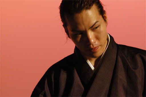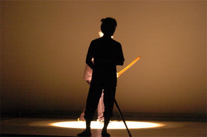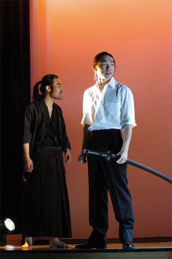 その前に立つ(手前)小金井兵庫役:竹端裕二、(奥)沖田総司役:永森栄一。
