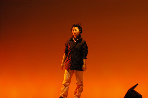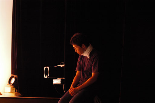 照明の立つ位置のチェック中のたか子役:中川英子。