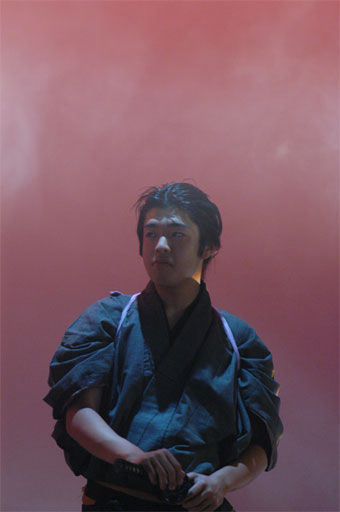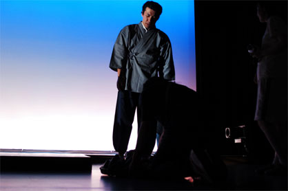 こちらも照明の当たり具合を確認中の 三鷹銀太夫役:尾ヶ口 徹。