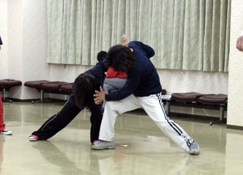 なにやら格闘しているおばあちゃん役:南本清美とヒジカタ役:永森栄一