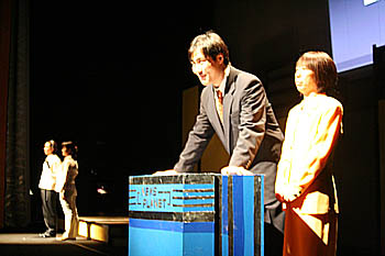 2ベルが鳴ったあと、客席のライトが消え、 人気報道番組「ニュースプラネット」のタイトル音楽とともに キャスターの2人の姿が見えてきました。