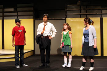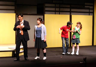 おばあちゃんを勝手に借りたことに対し抗議する子供達 右から、クリコ:喜多ゆうこ、カシオ、スギエ:大場希伊子 しかしお父さんは酔っ払って話を聞いていない様子・・・ こういう酔っ払いお父さんが嫌われるんですね!