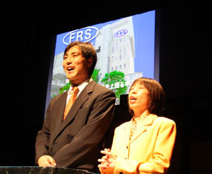 FRSの東京センターから報道を行うオオクボ:中川英子 インタビューを受けるFRS職員、サカモト:浦出貴永