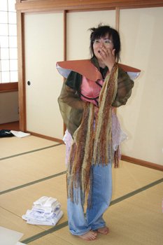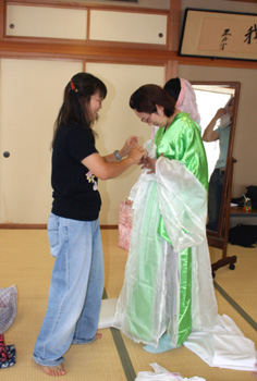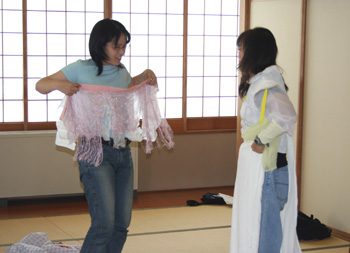 おなじく21回公演「西遊記」の人参女王の衣装を試着する南本清美。