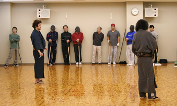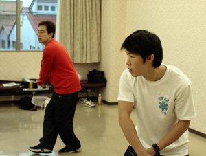 出番を待つ写真左、巍岩役:寺山 晋さん(劇団碧鳥)