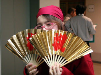 お祝いの扇子持って上機嫌