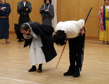 客席に向かって深々と礼をする犬神泥師役:ノジダイスケさん(遊人企画KAN-TAN)