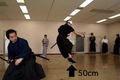 その隼助の後ろで、約50cm飛び上がっての鏡吾役:中島 亮。