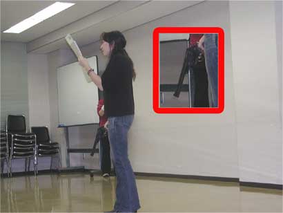 レイ役:竹鼻ともみの右手には、拳銃があります。。