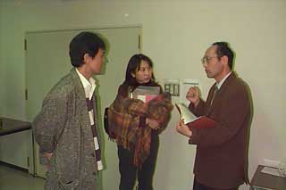 高岡演劇鑑賞会の前田さん(写真左)と吉野さん(写真右)から「海辺にて」の取材を受けました。