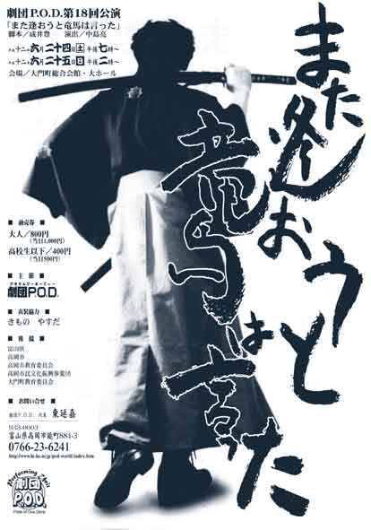 初の主役にはオカモト役『前田 圭一』が個性を爆発させ、スピードある舞台演出の主軸になり、一心同体/坂本竜馬役に『中島 亮』。客演として「劇団すばる」から初参集『ニーチェ 石原』、劇団A・A・Oから『四柳 直人』が熱く脇を固めています。他のキャストも演出からの指示だけでなく、解釈が進んだリアルな演技に近づきました。新人では『永森 栄一』がデビューして、その実力の伸びは目を見張るものがありました。
