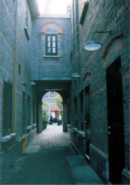 ここは「上海・新天地(シン・ティエン・ディ)」と言いまして、上海に昔存在した、かつてのフランス租界(そかい)の町並みを再現した新名所です。ここの写真を撮りたかったのですよ。この写真はそのエリアの路地で、バーやカフェがあります。なにかレンガ造りの建物が、第19回公演「キャンドル〜」のセットに似ていませんか? |