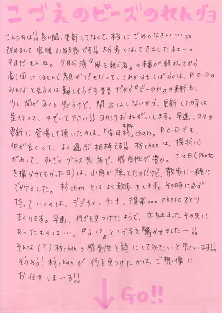 久々にビーのれ書いたらどんな感じで書いてたか…感じがつかめませんでした(;^_^A 今度の更新までまた間があくけど楽しいものをお届けできるようにしますから楽しみにしてて下さいね!