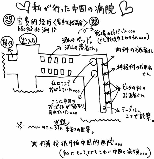 結局は病院へ行ったのですが、内科の隣に神経科があって、それもテーブル越しの診察です。。。そのテーブルは一列に長いもので、科によって、壁があるわけでもなく、診察と、受付が別れているわけでもなく、全てそのテーブルで受付と、診察です。周りを見渡すと、ベッドに寝て点滴をしてる人が沢山いて、ここは戦場か?と思うような光景でした。お医者さんから言われた事は「注射をしなければ、どんな病気か分かりません」って、、、、笑顔で言うんですよ。日本の友達から、メールで「注射は、絶対にしちゃだめだよ」というアドバイスをうけていました。だから注射は絶対にしないと決めていました。なのになのに、注射をしなきゃ、どんな病気か分からないなんて!!あげくに、感染病かもしれないとまで言われて。。。注射をしないと、風邪か感染病か分からないし、、でもでも、注射して、何かに感染したらどうするのーーーー!!!これは本当に生きるか死ぬかの選択でした(==;)