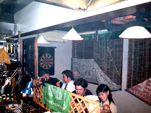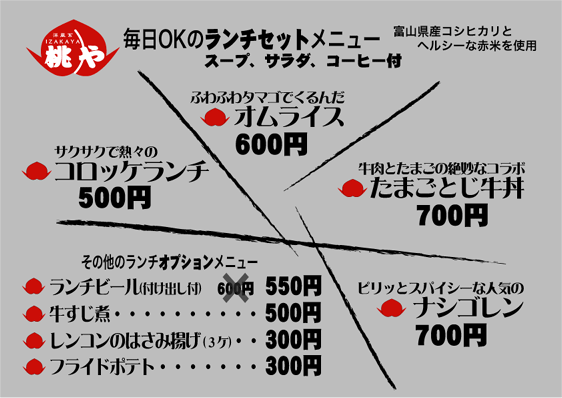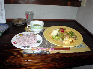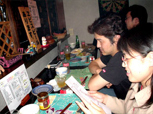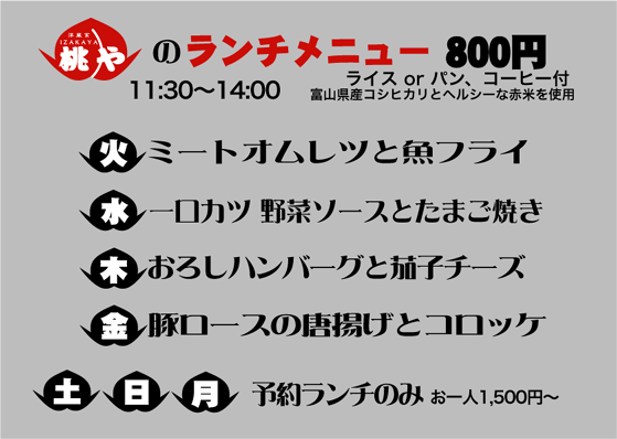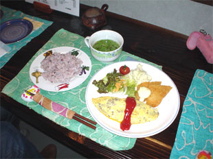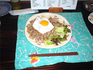 vol.3 「桃や」でランチメニューの試食をしました!! 今回のレポート、写真撮影は、劇団P.O.D.記録係です。 2004年5月24日(月)のランチサービス開始前に 日替わりランチの試食会がありました。 参加者は「味には厳しい」(笑)面々が参集いたしました。 たまたま来店という話もありますが・・・。(笑) 手前から中河香理、中島 亮、安田尚義、福埜一也さん 協力いただきまして感謝いたします。 どんなランチメニューが出てくるのか楽しみですね。 まずは中島 亮君に月曜日メニュー 「ミートオムレツと魚フライ」 ふわふわな卵にジューシーなひき肉のオムレツが 高級な雰囲気をかもし出しております。 中島君は試食会にもかかわらず感想もそこそこに ぺロッと平らげてしまいました(笑)。 福埜一也さんには、木曜日メニュー 「プレーンオムレツ茸ソースと茄子フライ」 ふわっとしたオムレツにトロッとした茸のソースがかかり、 上品な味わいに仕上がっております。 福埜さんも試食会にもかかわらず感想もそこそこに ペロッと平らげていただきました(笑)。 ※福埜さんは、劇団P.O.D.の公演をよく御覧いただいているお客様です。 三谷幸喜さんの作品も東京で、よく観劇されているとのこと。 中河香理さんには、金曜日メニュー 「チキンソテー バルサミコ風味と焼たまご」 やわらかいチキンを香ばしいバルサミコ風味のソースで炒め、 ふわふわの焼きたまごを添えてあります。 中河さんのお口にあったようで、 感想をお聞きする前に完食されておりました(笑)。 安田尚義さんには、夜の新メニュー 「ナシゴレン<東南アジア風焼飯>」 安田2号 曰く「これは又食べたくなる味」とのこと。 「桃や」でウーロン茶を注文すると、 このような器に入って運ばれてきます。 みんな、おいしいランチメニューを試食して、 「道ができてしまった」ので、 他の一品メニューやドリンクを注文して、 楽しい時間を過ごしました。 ※上記のレポートから、更に新しいランチメニューがスタートしました。 これらが、ランチメニューです。 次回のレポートもお楽しみに。 夜のメニューも増えておりますし、 話題が多いですよ。 つづく