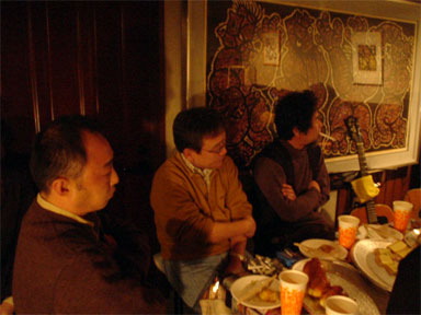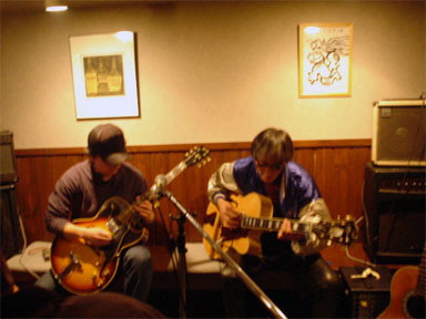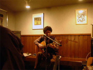 ★★ ★★ ★★ ★★ ★★ ★★ ★★ 皆さんを職業で紹介しているのは 桃やのオーナーシェフのアイディアです。 皆さんそれぞれに仕事をしていて 趣味でギターを弾いたり歌を歌ったり していらっしゃいます。 まず初めは"豆腐屋さん"です。 ソロでアコースティックギターを奏でていらっしゃいました。 もちろん歌もうたわれていましたよ。 シブかったです!! 続きまして、"散髪屋さん(左)"と"自転車屋さん(右)"です。 グループ名は"M&M (エム アンド エム)"です。 ファンク系?のインストのセッションらしいです。 すみません、私、詳しくないので・・・。 かっこよかったですよ〜。 "M&M (エム アンド エム)"に"豆腐屋さん(中央)"が参加してのセッション。 冬の定番songきよしこのよるを3本のギターで...しっとりしました。 少し早いクリスマスです。"自転車屋さん(右)"は"豆腐屋さん(中央)"の弟さんです。 ★★ ★★ ★★ ★★ ★★ ★★ ★★ 突然ですが、第一部は終わりまして(笑) 第ニ部へ続きます。 あ、大丈夫ですよ、第ニ部はすぐ見れます。