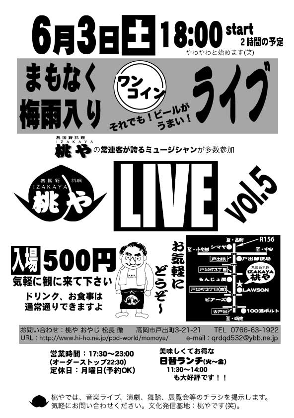 vol.25「まもなく梅雨入りワンコインLIVE」 レポートは記録係です。 6月3日(土)の桃やライブ情報が入りました。 生演奏はいいものです。いい音楽を聴きながら おいしいものを食べて飲んで、楽しい時間をお過ごしください。 18:00からやわやわ始まってます(笑) 安田三号が、音響担当するらしいのですが、 極秘情報ですが・・・、 「なんかするかも・・・」 とのことです(笑)。
