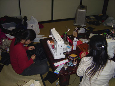 2006年1月1日(日) TOMTOMの報告 皆さん 明けましておめでとうございます 年越しは紅白の後、ゆく年くる年をみないと年を越した感がない私です。 あの情緒たっぷりの静かな雰囲気が大好きです。 子供の頃は陰気臭くて嫌だったのに、そりゃー今年で30になるから、 落ち着いて当たり前ですが・・・ さて、2006年になりましたね。公演まで1ヵ月ちょっと。 今回は、またまた合宿です。6回目の衣裳部屋で4回目の合宿です。 年の瀬に衣裳部屋に隊長夫婦と私の家族にサギリちゃん。 「これは一体何になるのだ??」と思うものから、 分かりやすいものまでざくざく縫いました。 家の娘はハサミばかりを触りたがるので、私は怒ってばかりでした。 今回は写真たくさん撮ったので、重くなるかもしれませんがいっぱい載せます。 図1 もじもじ君もどきの怪しい二人(しかも嬉しそう) 図2 ハートレンジャー登場!(注:こんなヒーローは登場しません) 図3 衣裳部屋の惨状。 図4 衣装部屋の惨状。その2 普段は、新しくて綺麗な隊長の衣裳部屋が作業を始めると こんなぐちゃぐちゃで足の踏み場もない状態になります。 そして8時過ぎに旦那と娘は帰宅。 今回も私は2時過ぎに退散しました。 ちなみに隊長夫妻は年越しもこの部屋でです。 お疲れ様です・・・